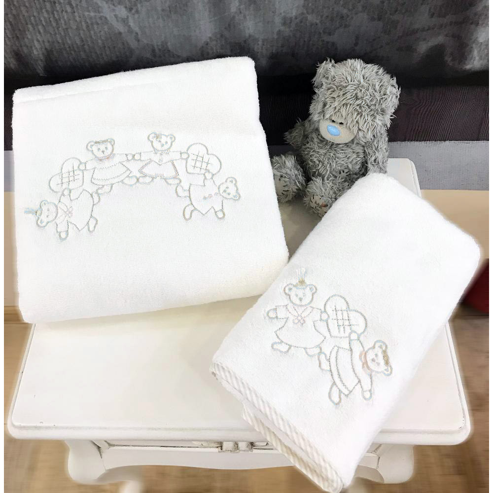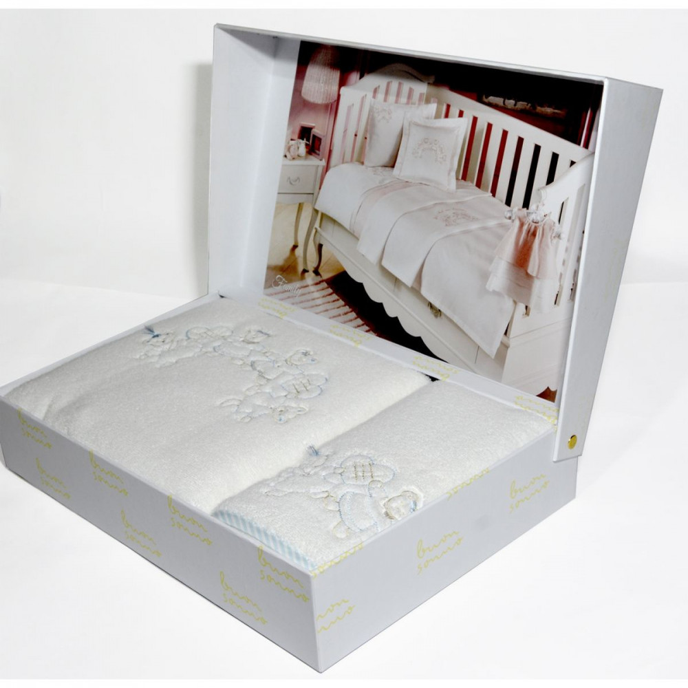 Прекрасный подарочный набор для полотенец для малышей от Tivolyo Home (Турция) с вышивкой в виде счастливой семьи медведей. Набор состоит из мягкого лицевого полотенца 50x90 и банного 70x130.
