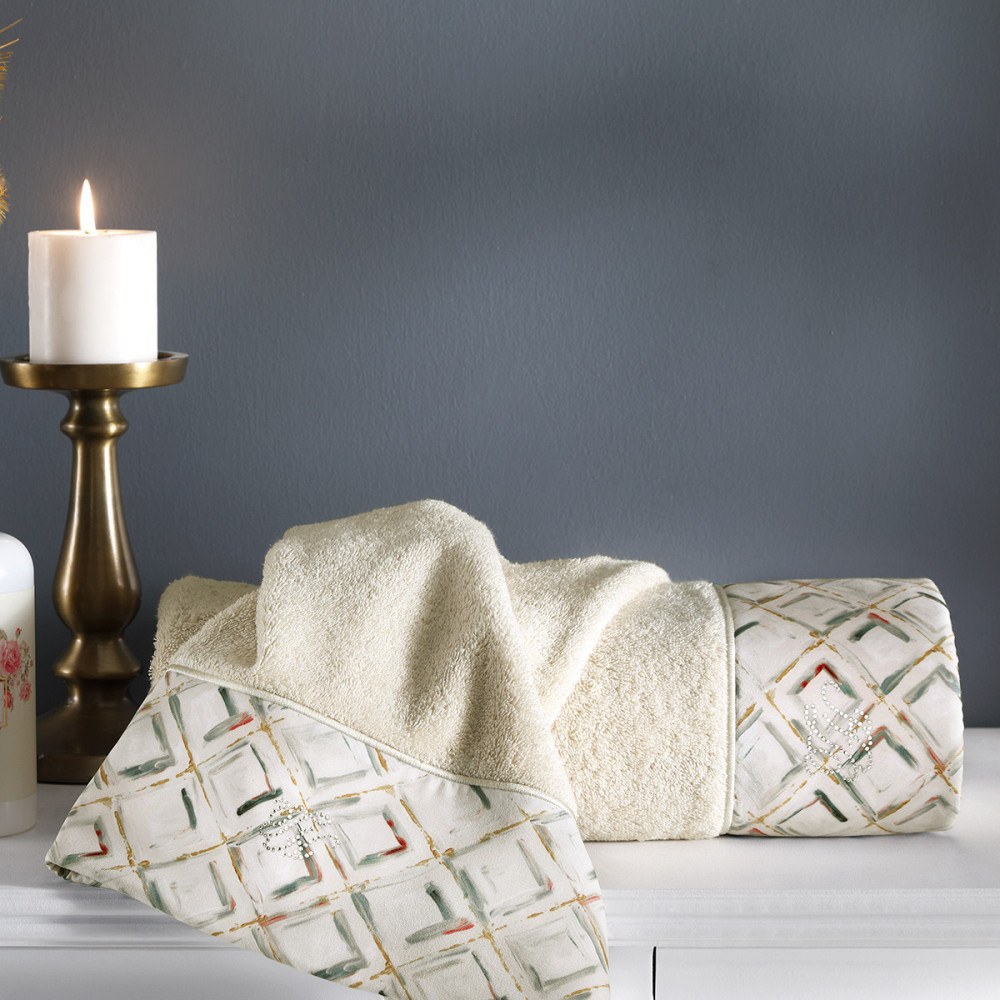 Каждое полотенце Tivolyo выполнено из высококачественной хлопковой махры и украшено очаровательным бордюром с оригинальным ромбовидным узором и фирменными стразами TH.