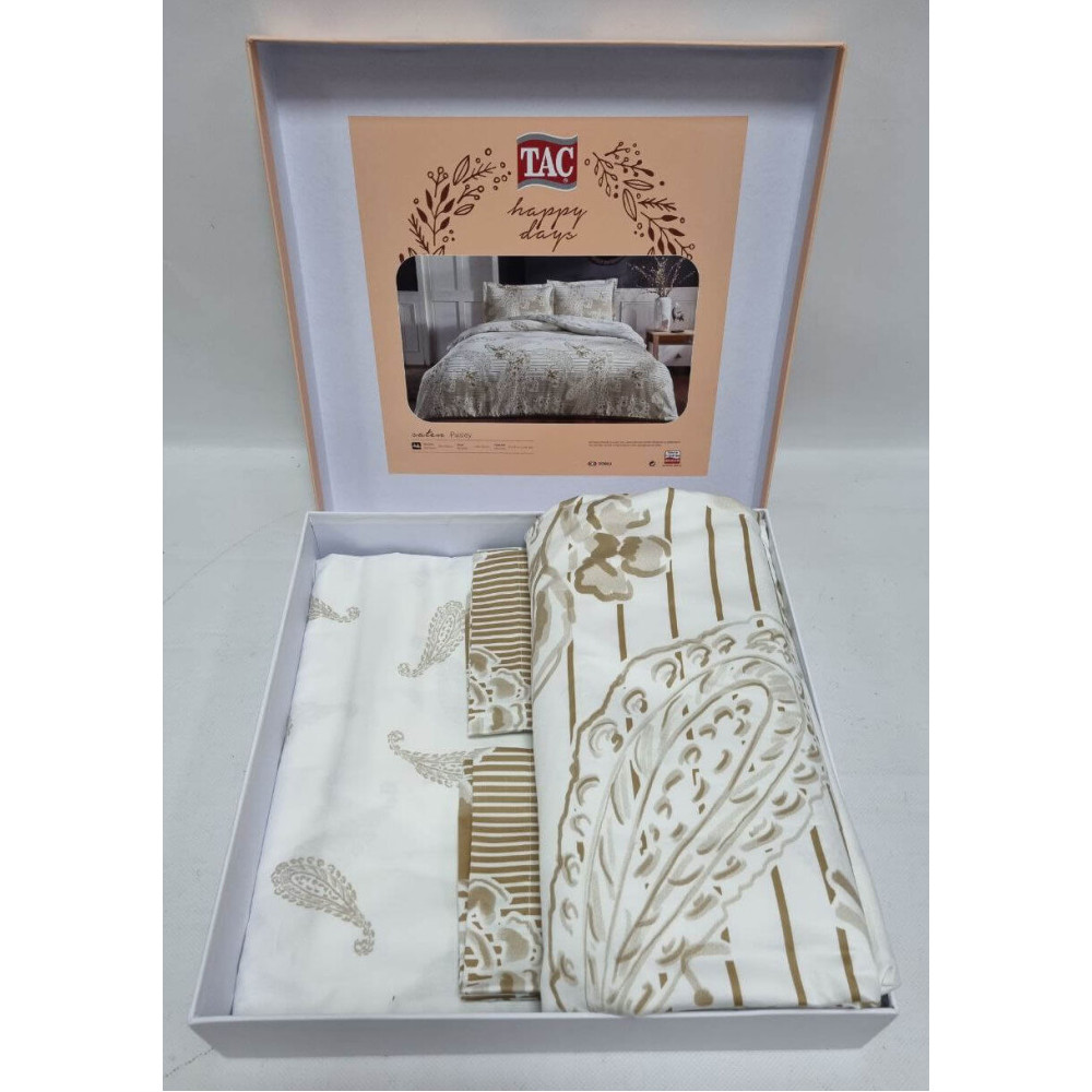 TAC - турецкое постельное белье с мировым именем; Комплекты разработаны из великолепного мягкого и нежного сатина высочайшего качества для самых требовательных потребителей, характеризуется четкостью прорисовки деталей рисунка и стильными изысканными дизайнами. Постельный набор упакован в картонную коробку; Постельное белье TAC идеально в качестве дорогого подарка на день рождения, юбилей, свадьбу, подчеркнет хороший вкус дарителя.